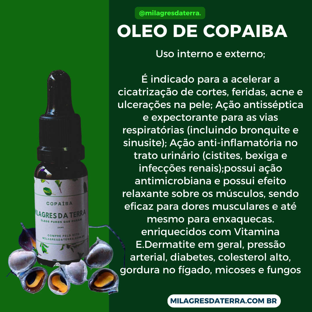 O que é óleo de copaíba Milagres da Terra ?A copaíba, de nome científico Copaifera langsdorffii, é uma árvore muito comum na Amazônia, e é de onde se extrai o óleo de copaíba.Esse óleo é utilizado como um medicamento natural para uma série de enfermidades, devido principalmente à sua ação anti-inflamatória e antisséptica.